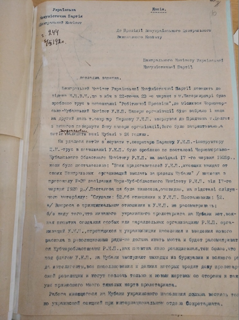 3 липня 1920 р. ЦК УКП подав доповідну записку до ВУЦВК про розгін організації УКП в Катеринодарі та висилку за межі Кубані т. Клименка. «ЦК УКП висловлює свій протест проти недопустимого непролетарського відношення до організації УКП і прохає довести до відома Всеросійського Центрального Виконавчого комітету і вимагати свободи агітації, пропаганди і організації для Української комуністичної партії на всіх землях, населених українським народом, виходячи із принципу об’єднання всіх українських земель в єдину республіку і комуністичного усвідомлення пролетаріату»36.